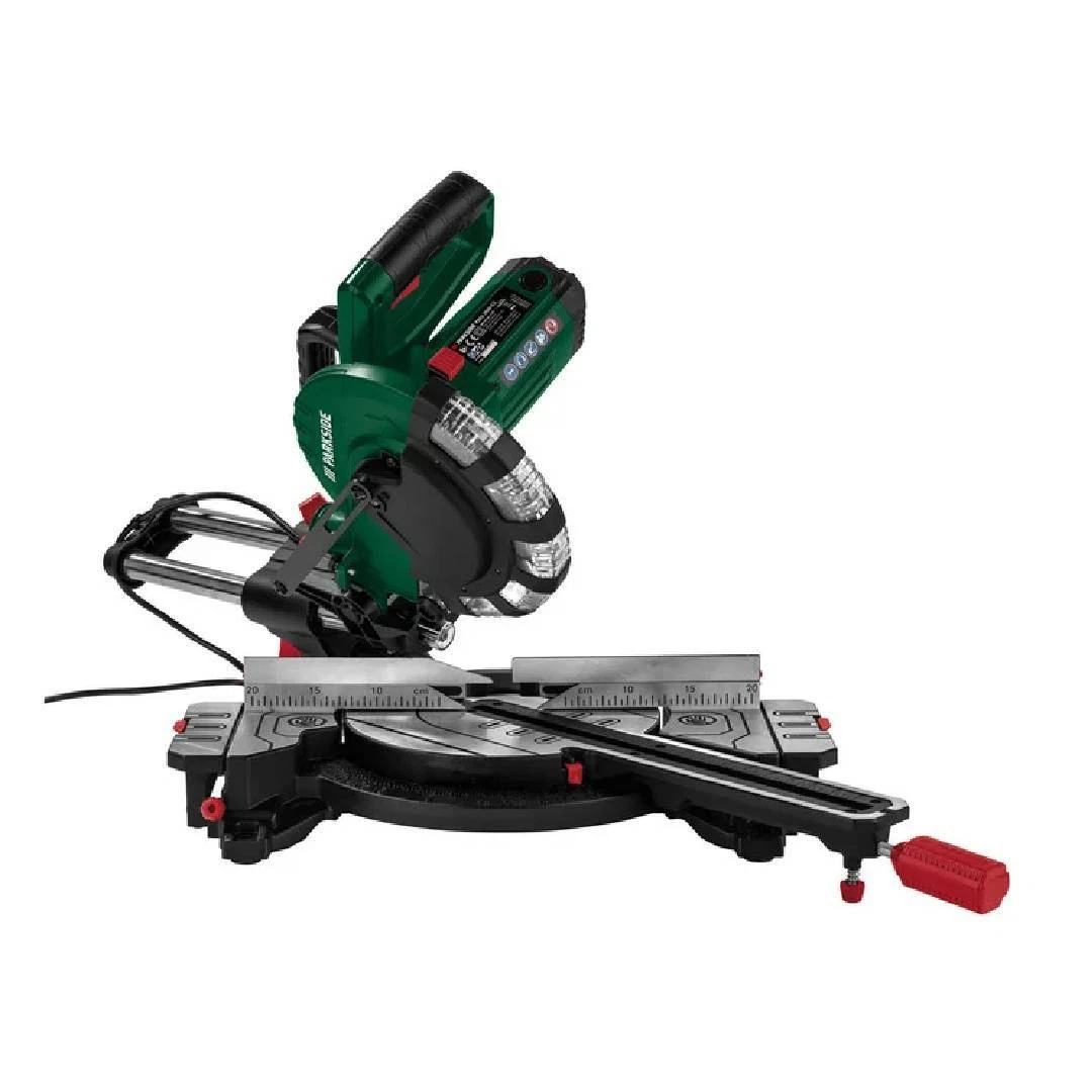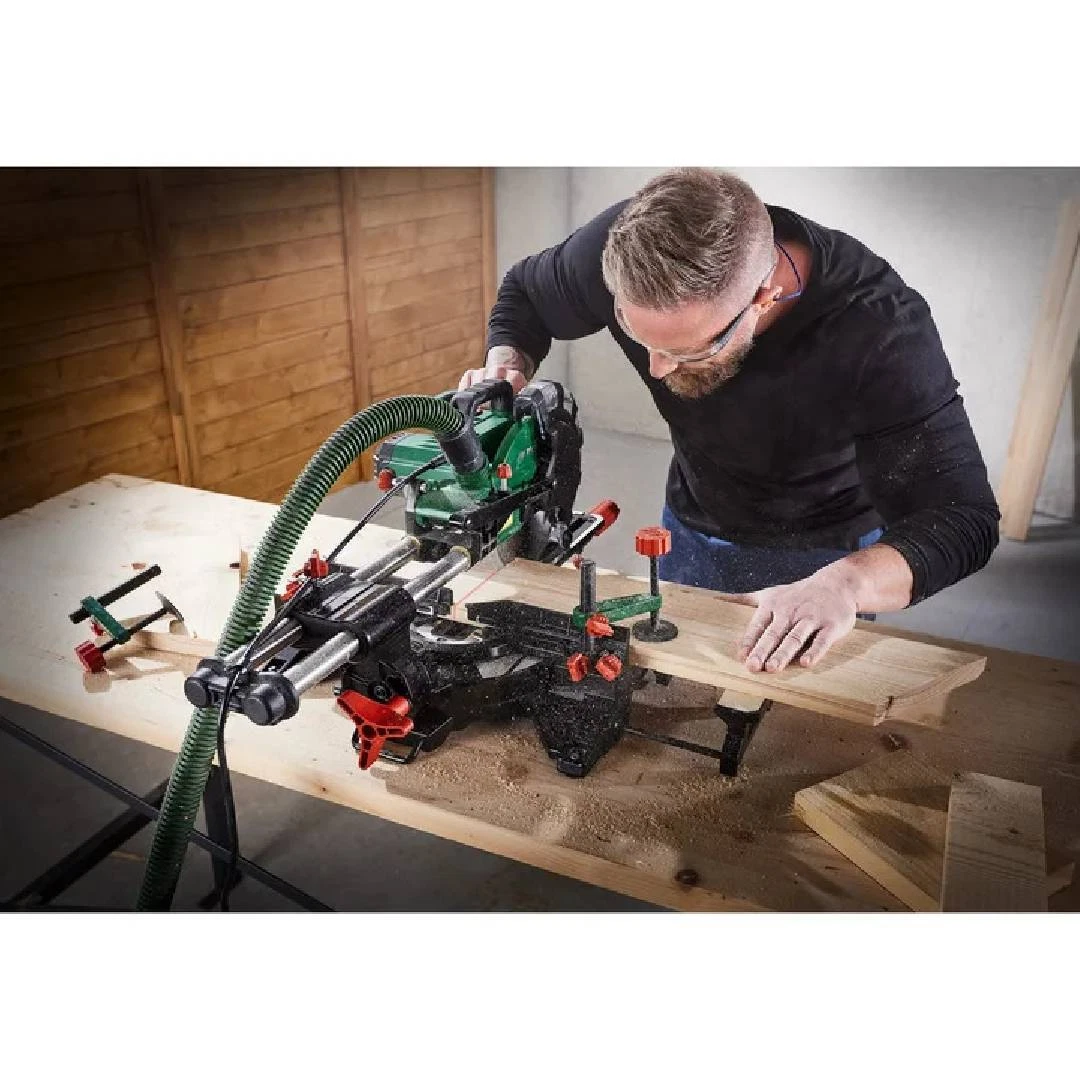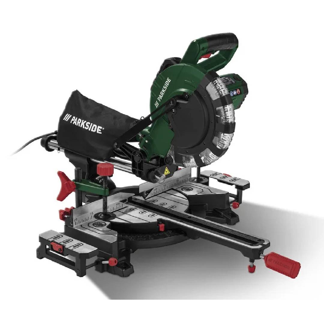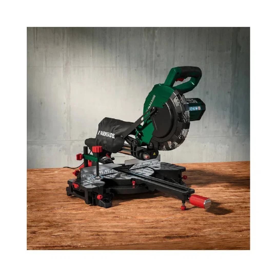 Sega circolare per tagli obliqui con funzione radiale, potenza 2000W e laser di precisione. Ideale per tagli netti su legno e plastica, dotata di sistema di aspirazione e doppia guida.