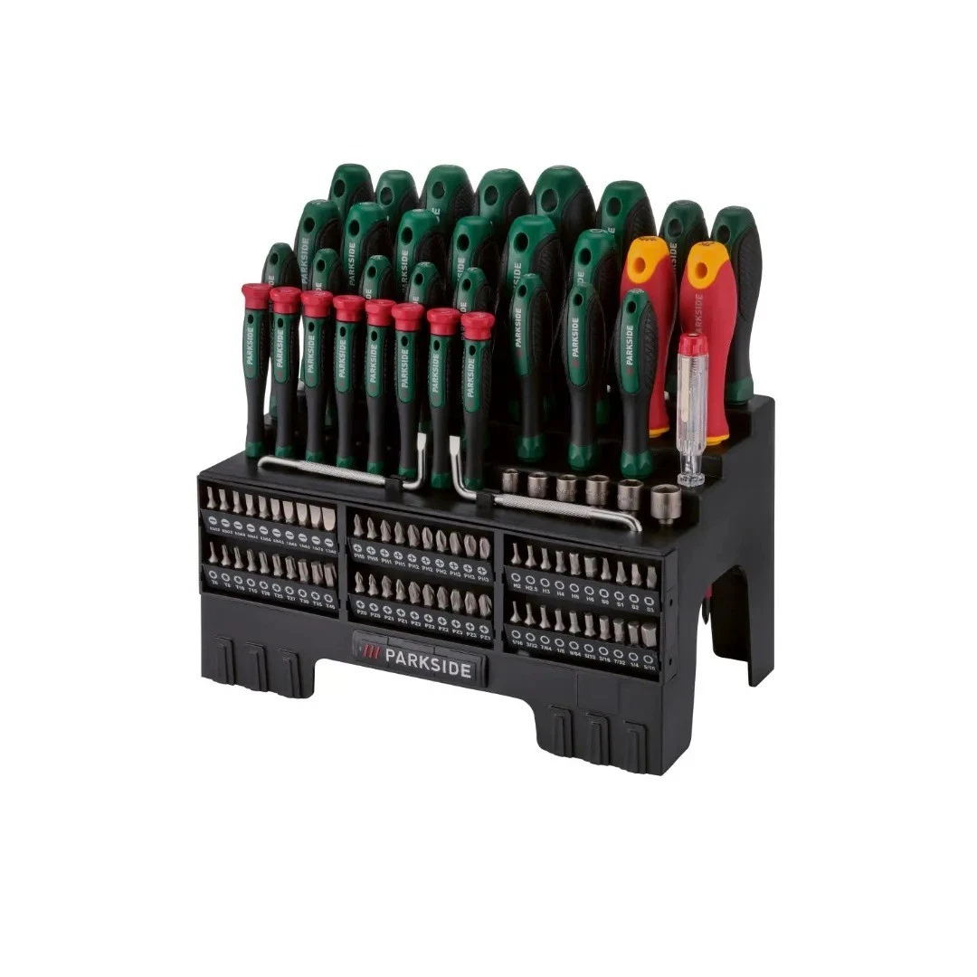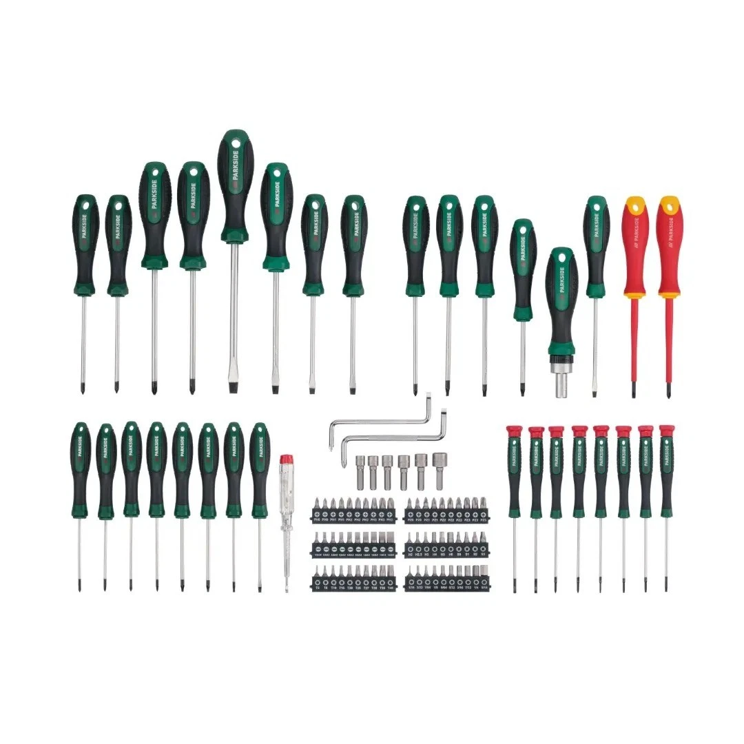 Il set Parkside è una collezione completa di utensili manuali progettata per l'officina e il fai-da-te, con impugnature ergonomiche, punte magnetiche e una custodia robusta.